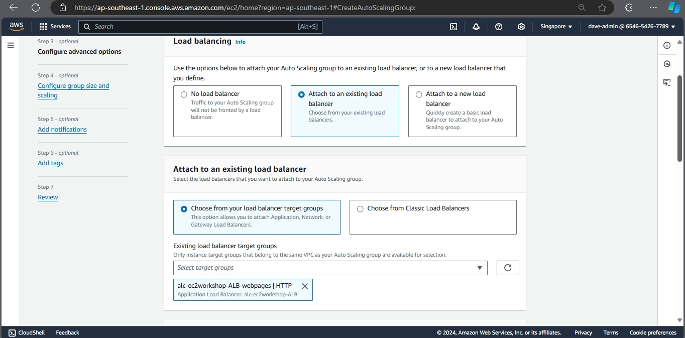 --target-group-arns arn:aws:elasticloadbalancing:ap-southeast-1:654654267789:targetgroup/alc-workshop-ec2-TG/64d292c1d82539e6