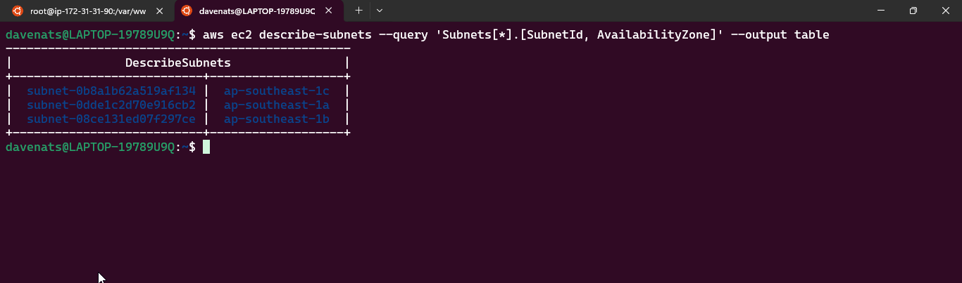 aws ec2 describe-subnets --query 'Subnets[*].[SubnetId, AvailabilityZone]' --output table