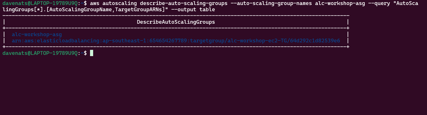 aws autoscaling describe-auto-scaling-groups --auto-scaling-group-names alc-workshop-asg --query "AutoScalingGroups[*].[AutoScalingGroupName,TargetGroupARNs]" --output table