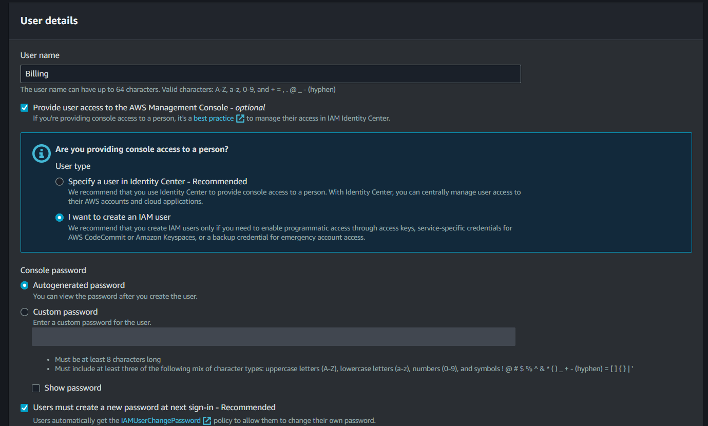 - Granting Access: Detailed steps for providing IAM users with access to the billing console.