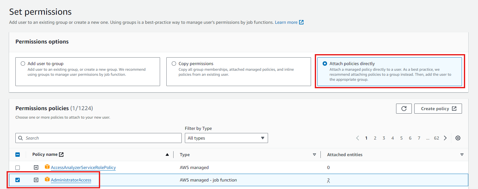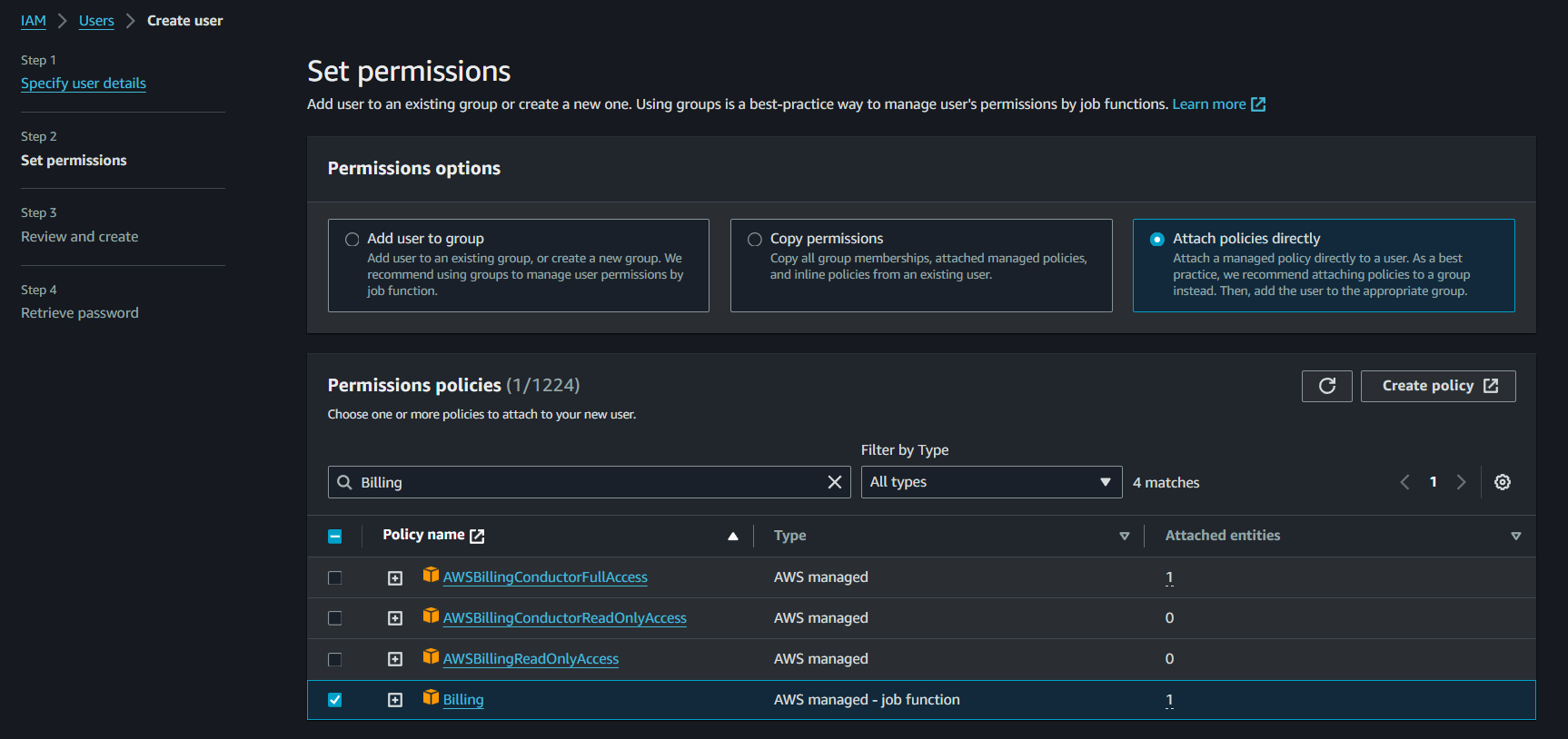 Set permissions for the user. Choose Attach policies directly and then look for Billing in the permission policies.