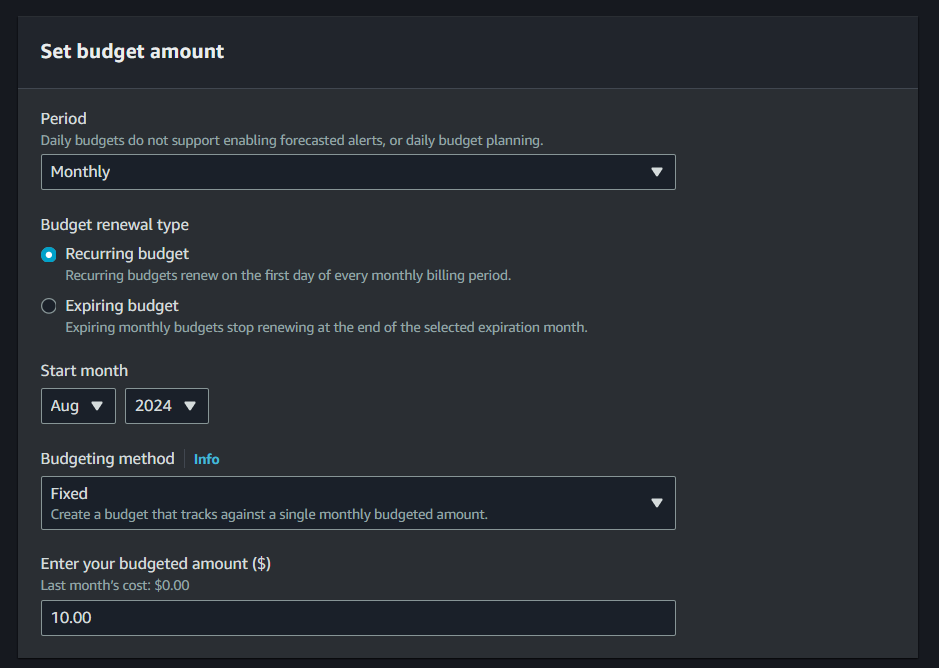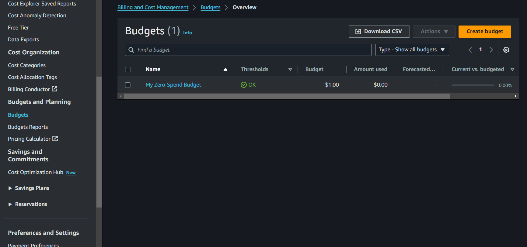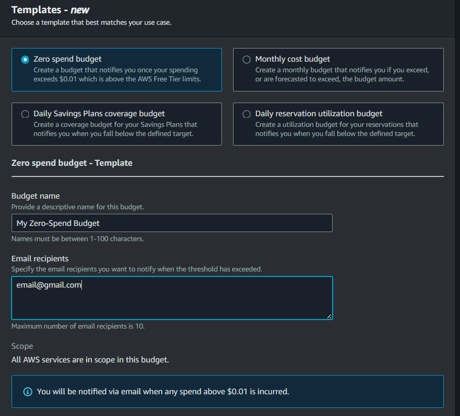 - Zero spend budget: A budget that notifies you after your spending exceeds AWS Free Tier limits ($0.01)