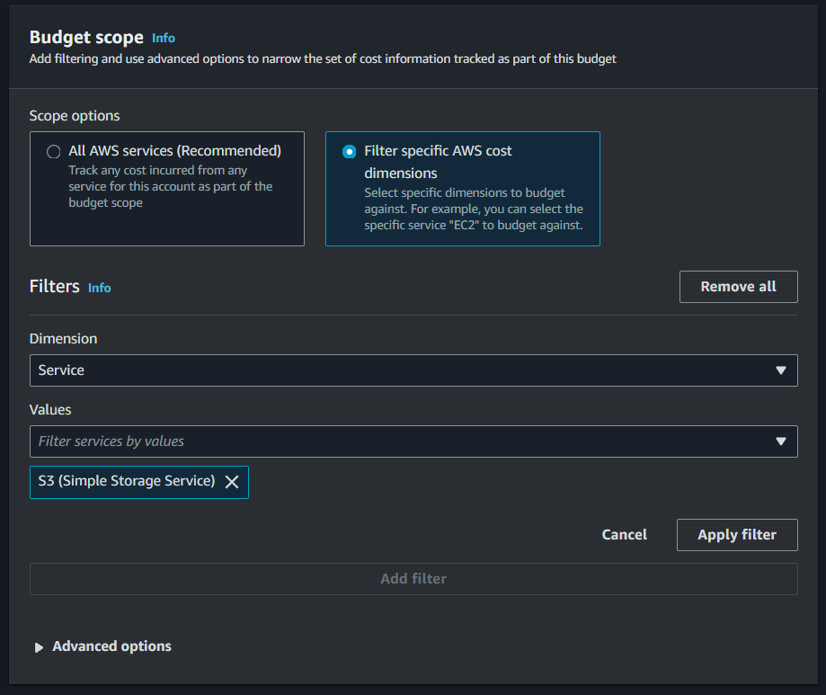 - Specify the budget scope: Choose whether the budget should apply to your entire account or specific services, cost categories, or tags.