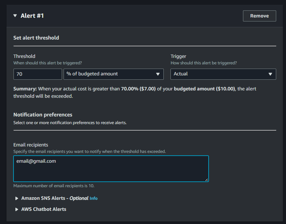 Then, you can move on to the notification preferences. The budget alerts can notify you via email, SNS, or chatbot alerts.