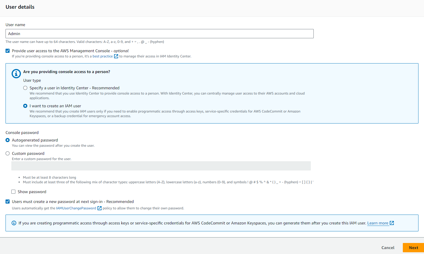 - Admin User Creation: Detailed process for setting up an admin IAM user with appropriate permissions.