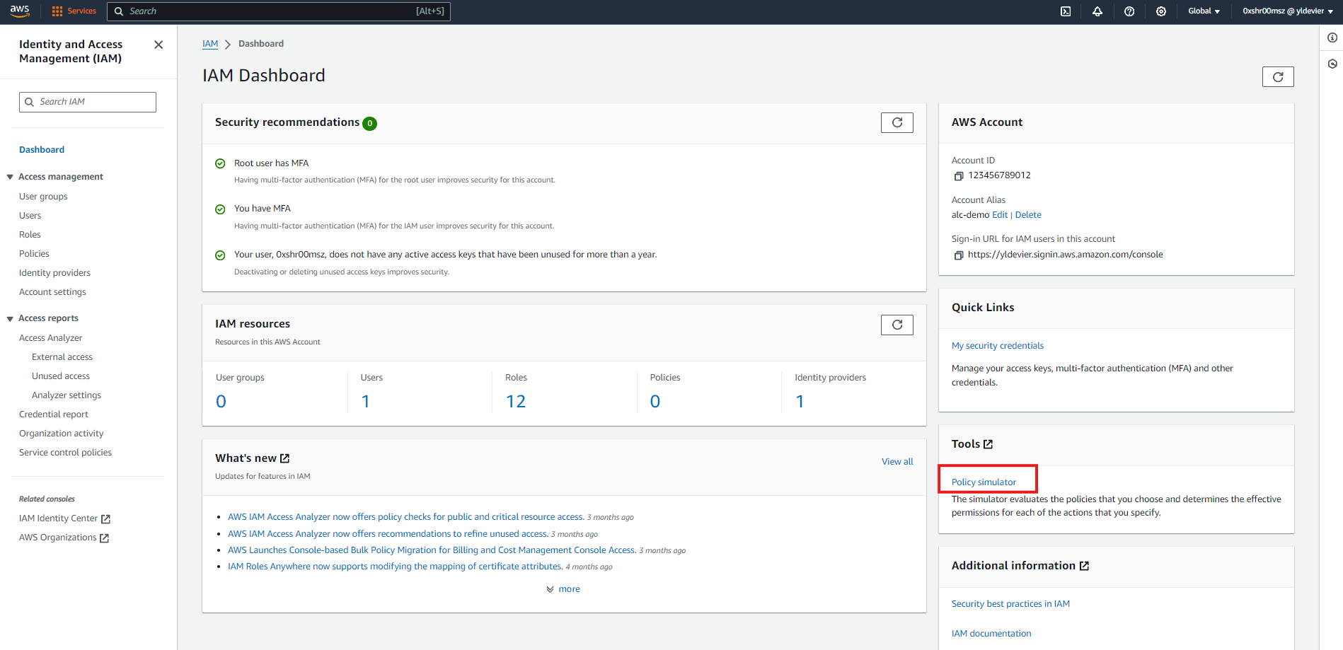 Navigate to Policy Simulator: Once in the IAM dashboard, look for “Policy Simulator” under the “Tools” section on the right-hand menu.