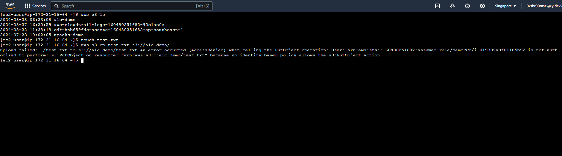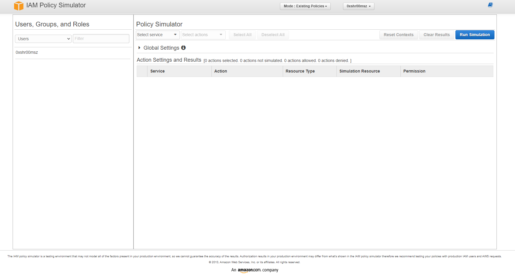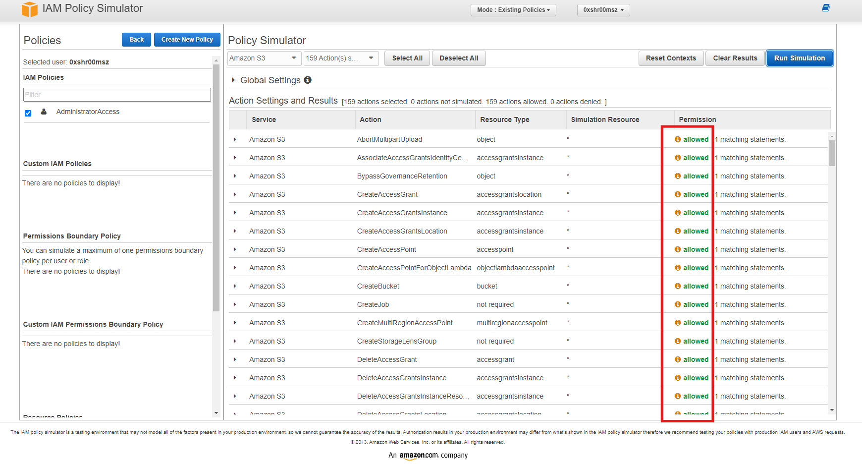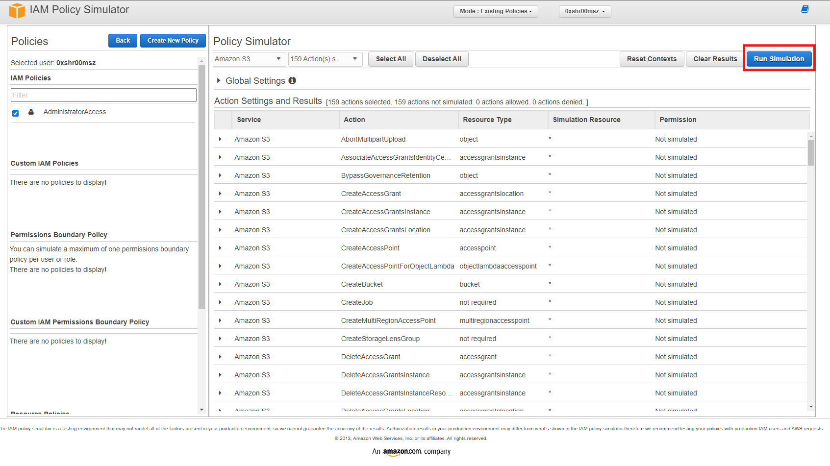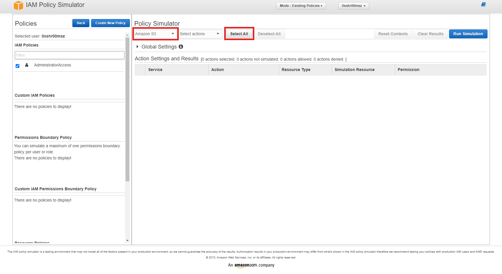 0xshr00mszusing Amazon S3, selecting all of its actions and simulate.