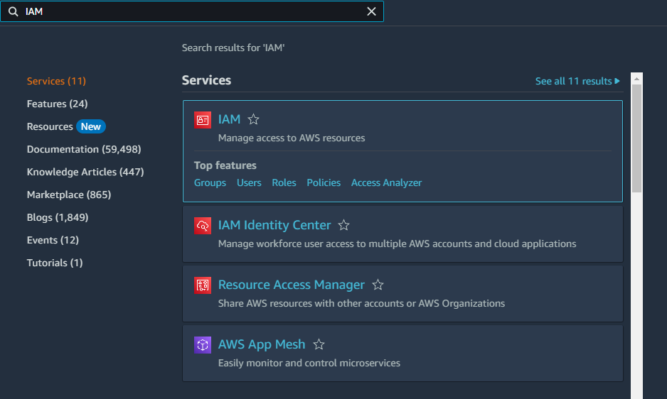 Search for IAM: In the search bar, type “IAM” and select it from the dropdown list.